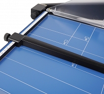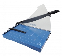 Solidna gilotyna biurowa z ręcznym systemem docisku papieru, dużym roboczym blatem z szablonami różnych formatów. Gilotyna posiada długie ostrze tnące wykonane z hartowanej stali oraz bezpieczny uchwyt. Długie ostrze pozwala przyciąć format A2 po krótszym boku.